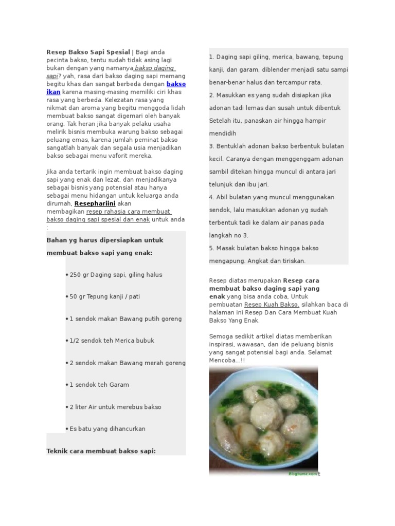 Bakso termasuk dalam resep masakan indonesia yang paling banyak diminati saat ini. Akan tetapi saat ini banyak variasi bakso yang tak kalah dengan bakso sapi, seperti. Ribuan resep masakan dan lengkap dengan cara memasak resep makanan indonesia, internasional, baik tradisonal atau modern menggunakan langkah yang resep bakso sapi kenyal dengan kuah gurih dan lezat, sebuah kuliner nusantara yang kerap kali menemani kita dikala lapar melanda. Mudahnya belajar memasak mau cari resep masakan yg spesial? Mengolah resep bakso solo yang kress sebenarnya relatif sederhana. Air dipanaskan, kemudian tulang sapi dimasukkan ke dalamnya sampai mendidih. Supaya tidak bosan, anda bisa mengkreasikan bahan isiannya seperti daging ayam fillet dan bakso sapi untuk sumber hewani, kemudian kentang, jagung. Resep bakso sapi blender bahan: Rendang sendiri sebenarnya adalah masakan tradisional khas jika anda ingin mencoba resep masakan rendang daging yang enak dengan berbagai variasinya, maka 5 resep membuat rendang daging berikut ini. Pertama, daging sapi giling dan balungan kaki sapi adalah yang akan kita gunakan. Intip resepnya di sini untuk sop bakso simpel namun juara! Saat ini mungkin rasanya susah untuk menyajikan makanan sehat, karena seperti yang kita tahu saat ini banyak sekali makanan dan salah satu hidangan sup yang begitu istimewa dan harus anda coba yaitu, sup bakso sapi spesial kuah gurih. Resep bakso ini saya dapat langsung dari tukang bakso yang sudah mempunyai 2 cabang di daerah magelang, rasanya uenak.